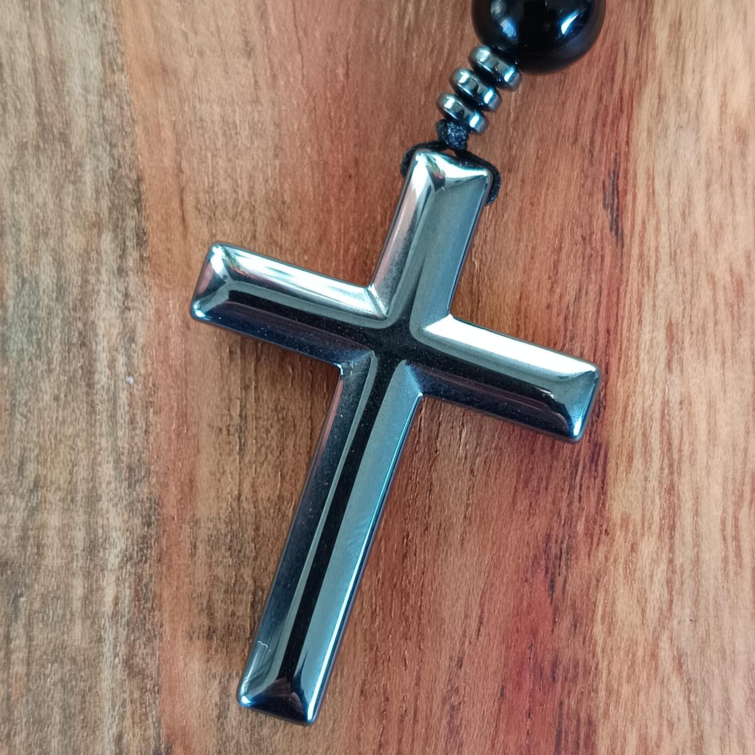 Materiali: croce in metallo, pietre naturali di pino rosso e agata nera