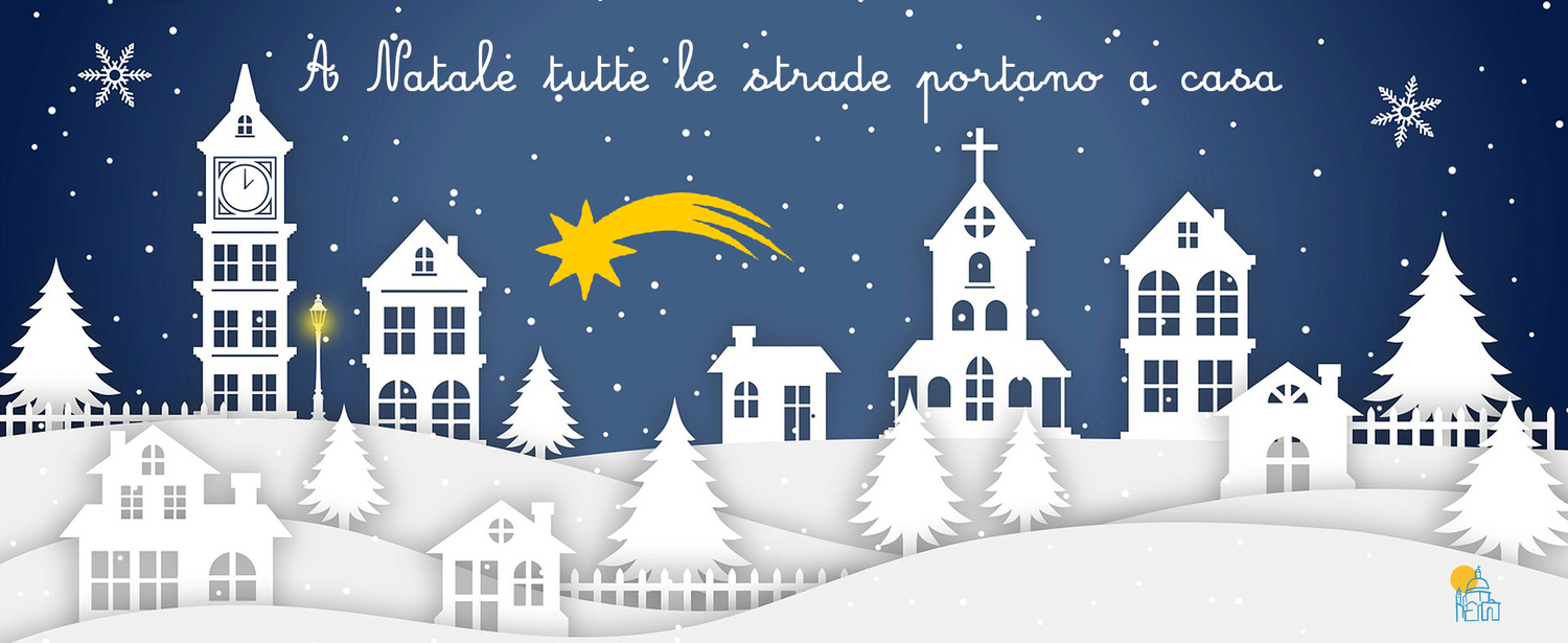 Il design cattura un paesaggio invernale notturno in stile "paper-cut" (ritagli di carta), con abeti innevati, casette, una chiesa con la croce e la stella cometa che illumina la scena. La frase in alto, “A Natale tutte le strade portano a casa”, aggiunge un tocco di profonda emozione e significato.