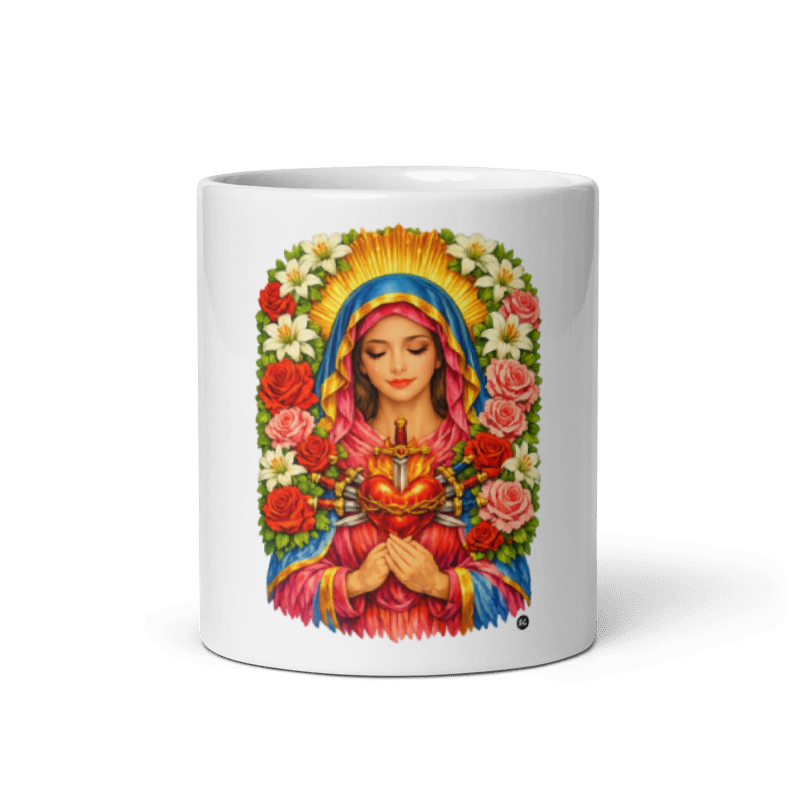 Questa tazza presenta il design dettagliato della Mater Dolorosa, circondata da una corona di fiori vibranti e con il cuore trafitto dalle sette spade simboliche.