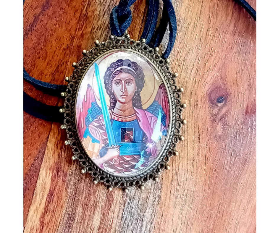 Questo pendente celebra la forza e il coraggio dell'Arcangelo Michele. L'icona lo raffigura con la spada, pronto a difendere i fedeli, ed è un amuleto di devozione molto caro a chi cerca protezione dalle avversità e dal male. L'immagine è protetta da una cupola in vetro (cabochon) che ne esalta la drammaticità e la vivacità dei colori.