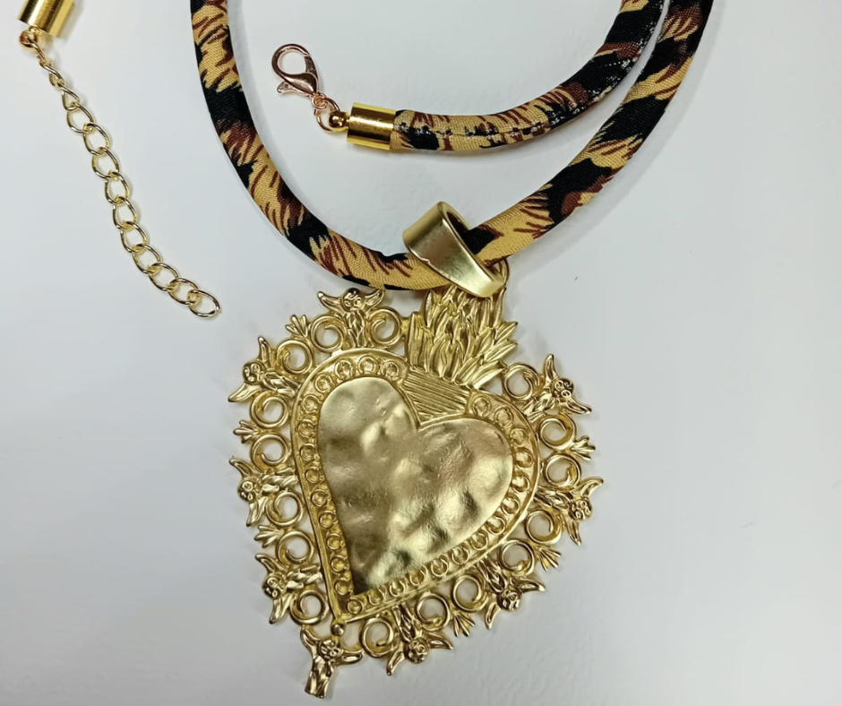 Scopri la collana con maxi cuore sacro in metallo dorato (6×5 cm) e cordone leopardato. Un accessorio unico, barocco e audace. Spedizione veloce.