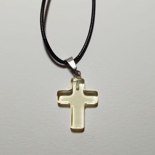Croce da indossare in vetro o pietra dura, dimensioni 2,5 × 1,8 cm. Con cordino e chiusura a moschettone, in elegante scatola. Un simbolo di fede da portare sempre con sé.