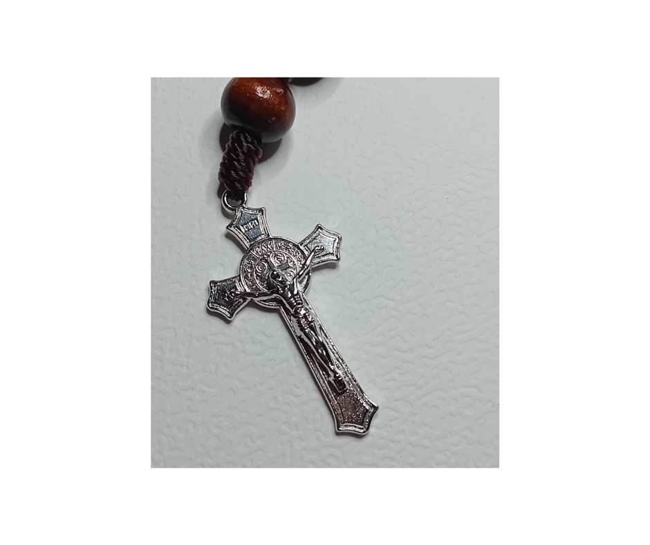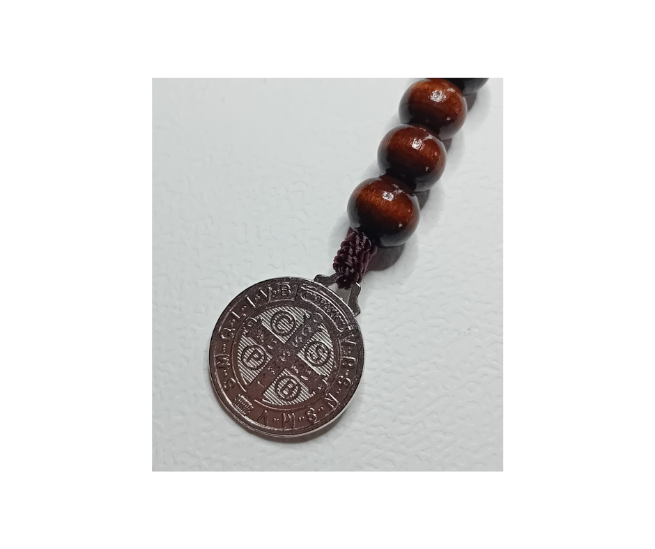 Questa decina di rosario è un oggetto essenziale che fonde natura e tradizione: dieci grani in legno di olivo naturale, una croce e la medaglia di San Benedetto.